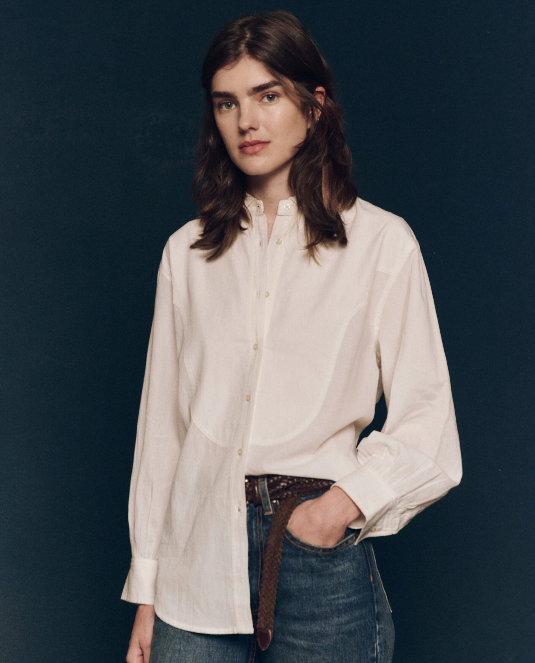 Taking notes from a soft and slouchy 1950s menswear button-up, The Cowboy Tux Top features airy, rumpled cotton with a striped texture. Western-style yokes and double-needle topstitching add vintage charm. Tall cuffs with pleating and a longer shirttail length provide the perfect finishing touches to this classic style.