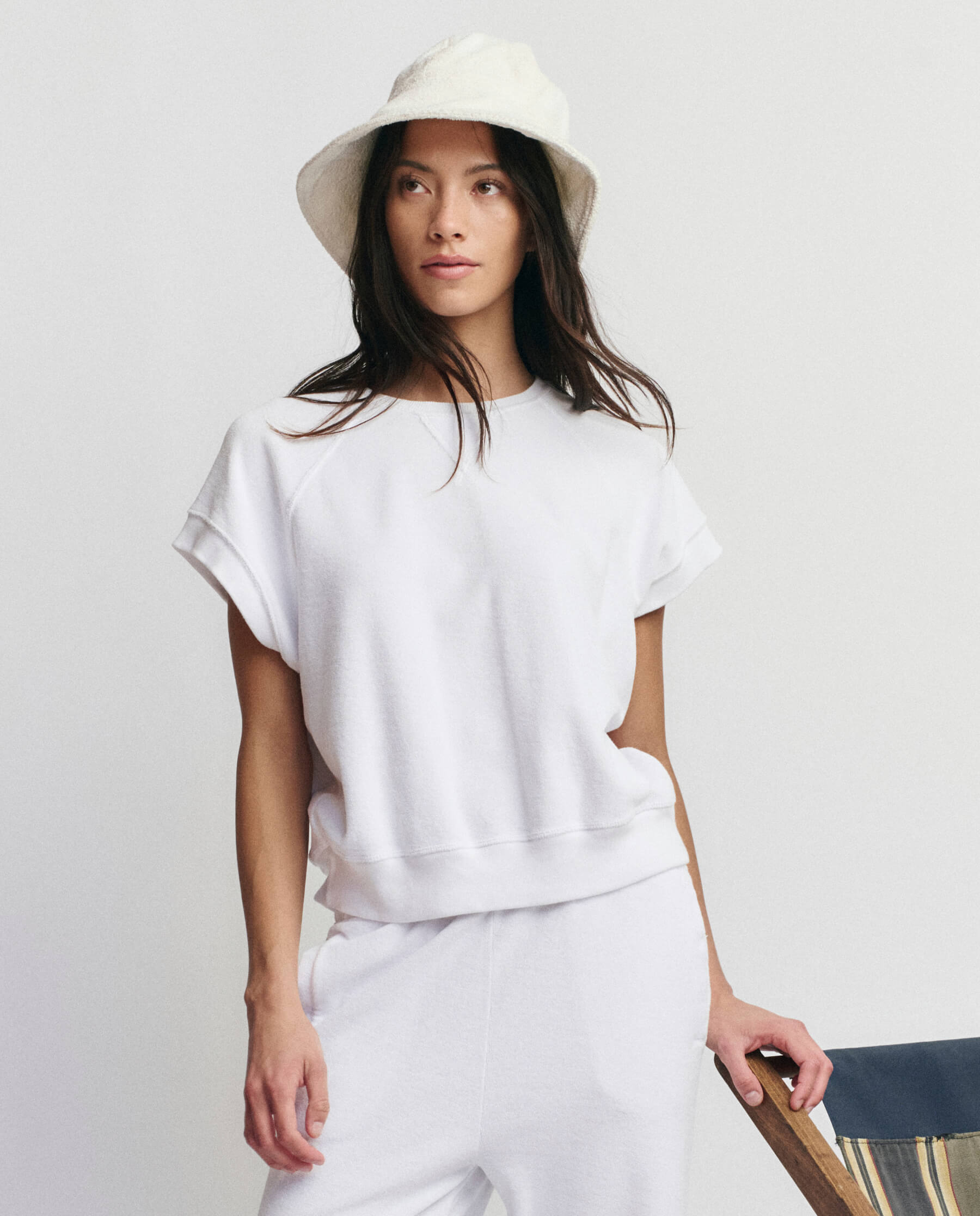 The Wedge Sweatshirt. is the perfect transition piece. Oversized and perfectly boxy, it features considered design details: a crew neck with a wedge-shaped sleeve, rib edging at the neck and sleeve openings, and authentic vintage-inspired Dorito detailing at the front neck. Updated with a Summer take on vintage knits in our cotton micro terry that has a softly washed hand feel.Handcrafted locally in L.A., our process ensures beauty and uniqueness—no two pieces are alike.
