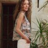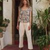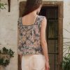 This top features pintuck and pleat detailing at the front and back neckline and shoulders, creating a refined, textured look. The flowy silhouette is crafted from lightweight, textured cotton slub, adorned with Pre Fall’s Indigo Floral Print. It has a square neckline trimmed with delicate cotton lace, a front button placket with shirting buttons, and scooped armholes with ruffle edges and a picot finish for added charm.