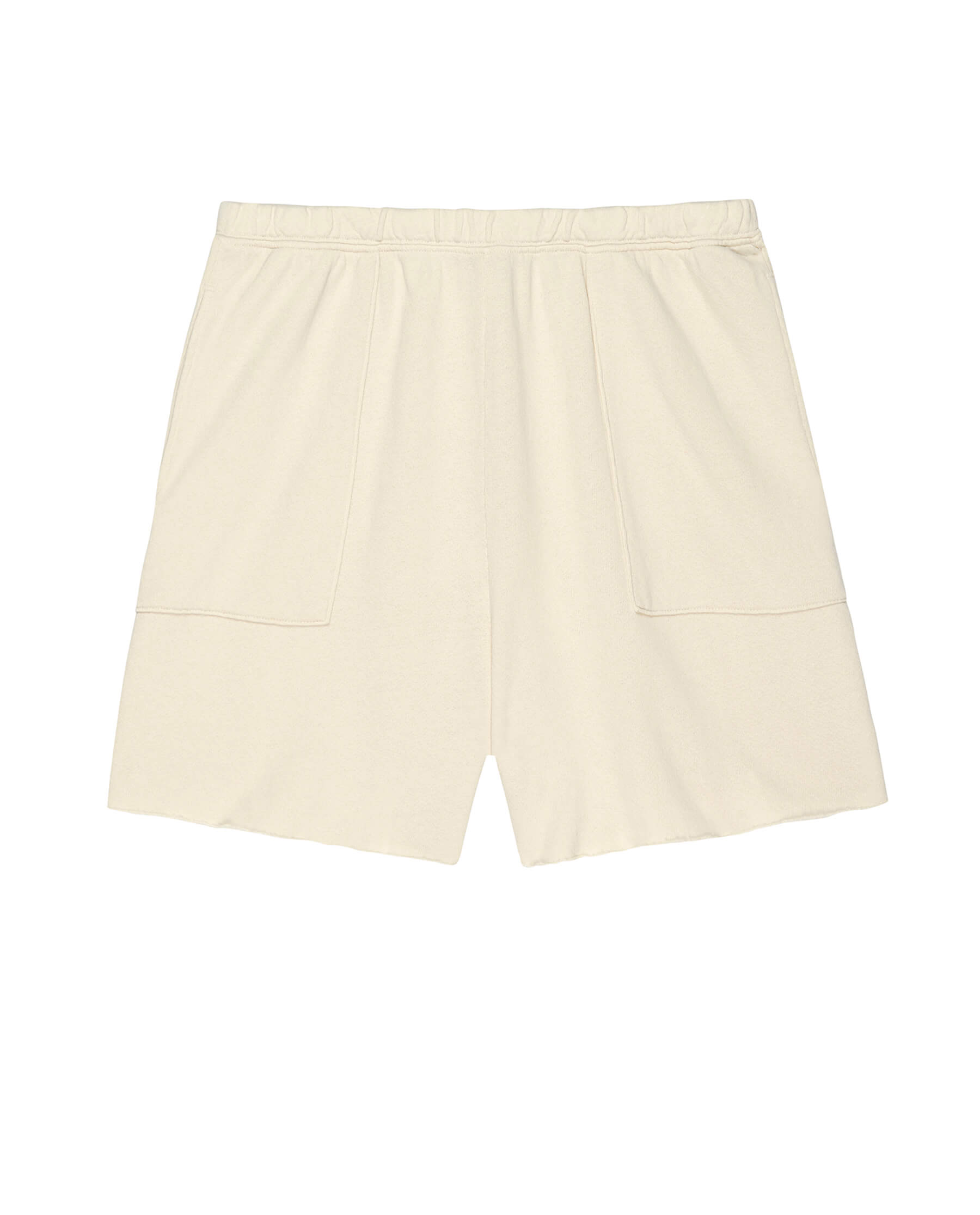 This sweat short is meant to be worn slouchy. It features both an elastic waistband and an interior cotton drawstring with brass tips, so it can be worn either slung low on the hips or high at the waist. The lightly frayed raw hem is cut long on the leg, and it features forever practical patch pockets. Our knits are crafted here in Los Angeles, ensuring authenticity, beauty and uniqueness in that no two pieces are alike.
